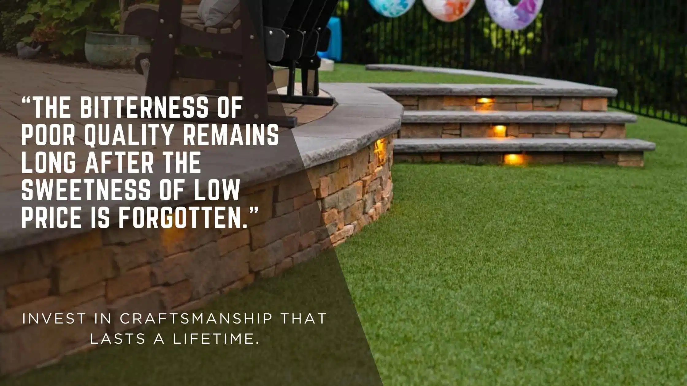 Luxury stone patio design in Chester County PA with text quote about the value of quality landscaping craftsmanship versus low bids.
